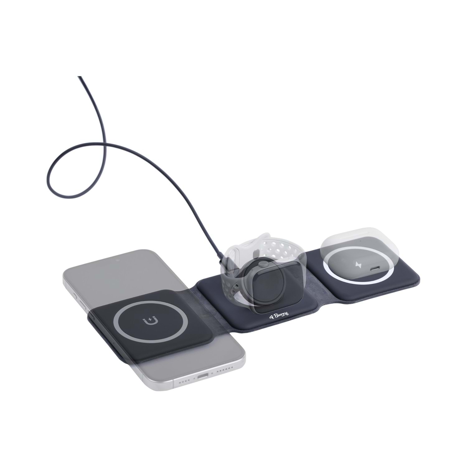 Tek Cihaz, Üçlü Güç! iPhone’unuzu, Apple Watch’unuzu ve AirPods’unuzu aynı anda şarj etmek ister misiniz? 4Berry’in geliştirdiği bu şık ve işlevsel 3 in 1 MagSafe Kablosuz Şarj Cihazı, masaüstü kullanımda konfor ve düzen arayan kullanıcılar için ideal!
